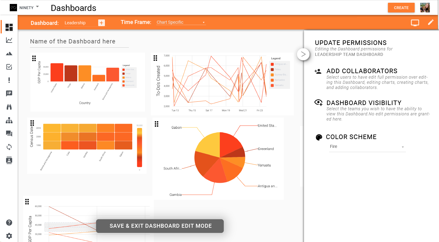 Create Dashboards to share with individuals, their team, or company as a whole.