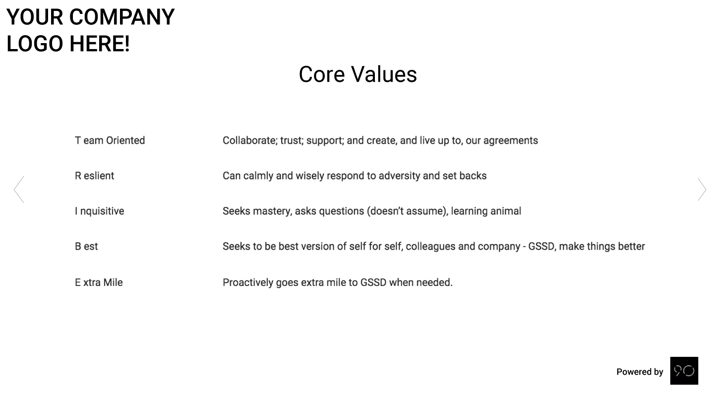 - Share scrolling shots of non-data information like: cascading messages, directory profile, pictures, Core Values, quotes, Job Postings, V/TO™, Accountability Chart, etc.